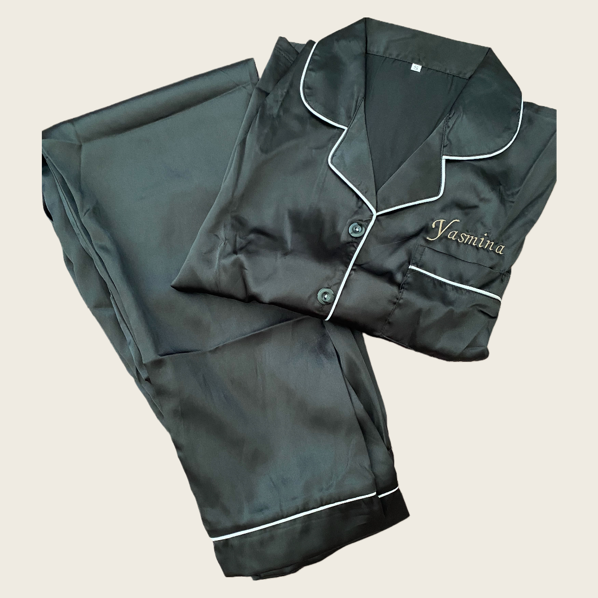 Soms kan er borduurfolie achterblijven op het product. Trek hier niet aan, maar was het product en het lost vanzelf op. De folie aan de binnenkant van de pyjama hoort erop te blijven zitten, voor een langdurig mooi resultaat.
