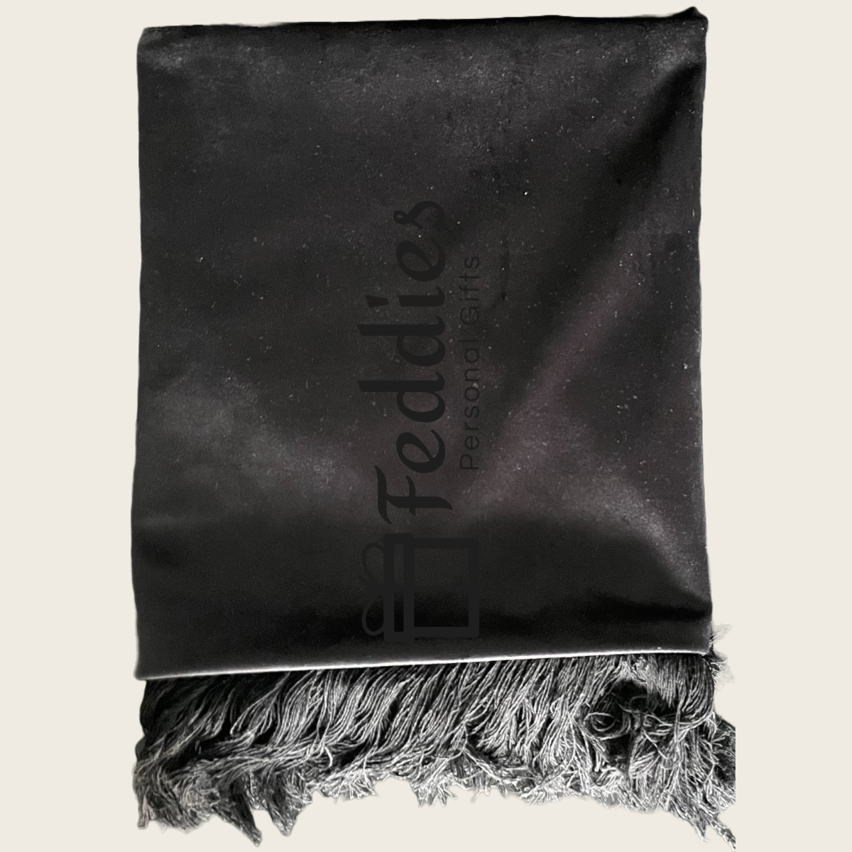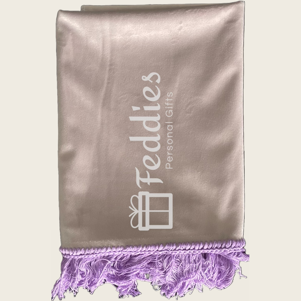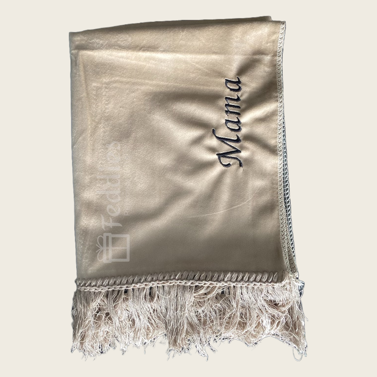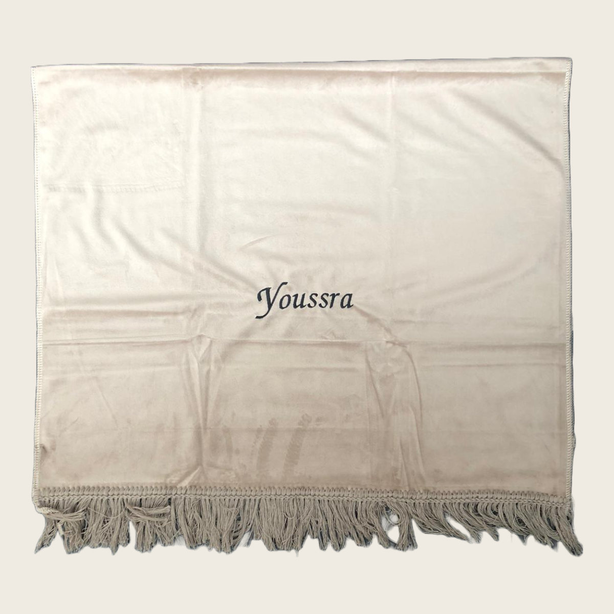 De naam wordt subtiel geborduurd en niet in het gezichtsveld om afleiding tijdens het gebed te voorkomen.