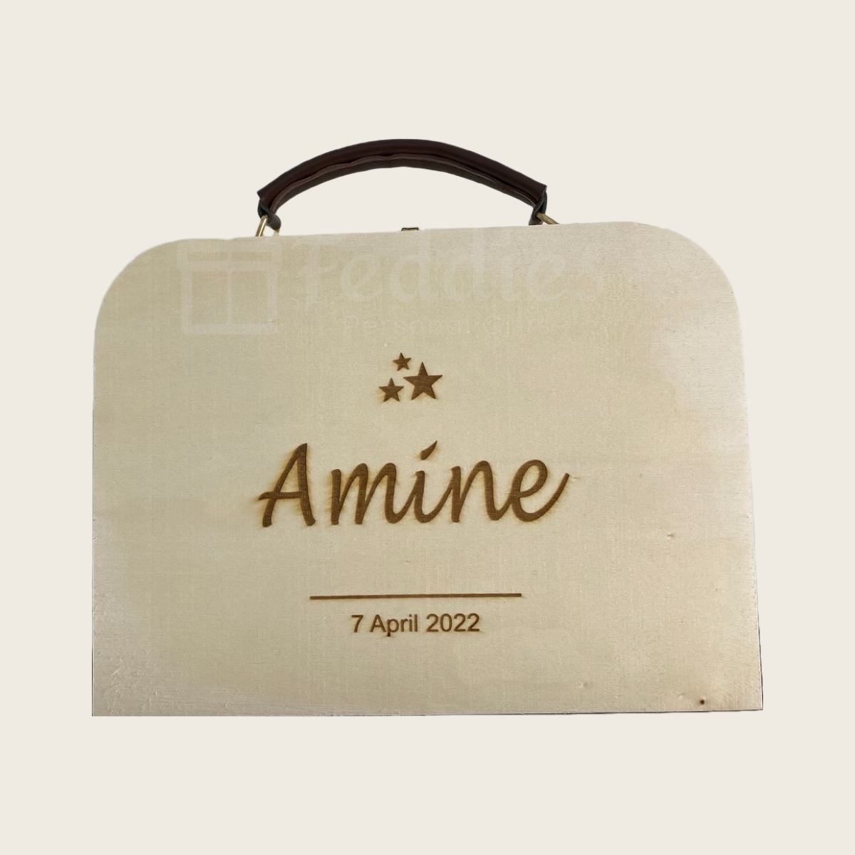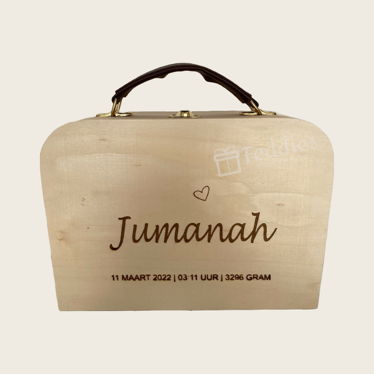 Een geweldig kraamcadeau geef je met dit gepersonaliseerd koffertje. Er wordt in het hout gegraveerd, dus het blijft mooi! Een super leuk accessoire voor op de babykamer en leuk om dierbare spulletjes in te bewaren.