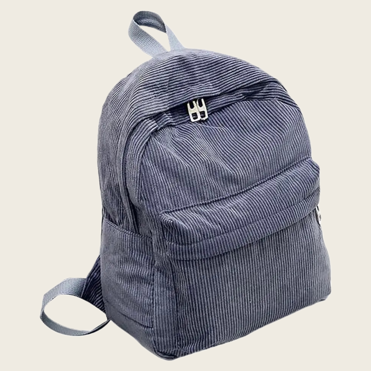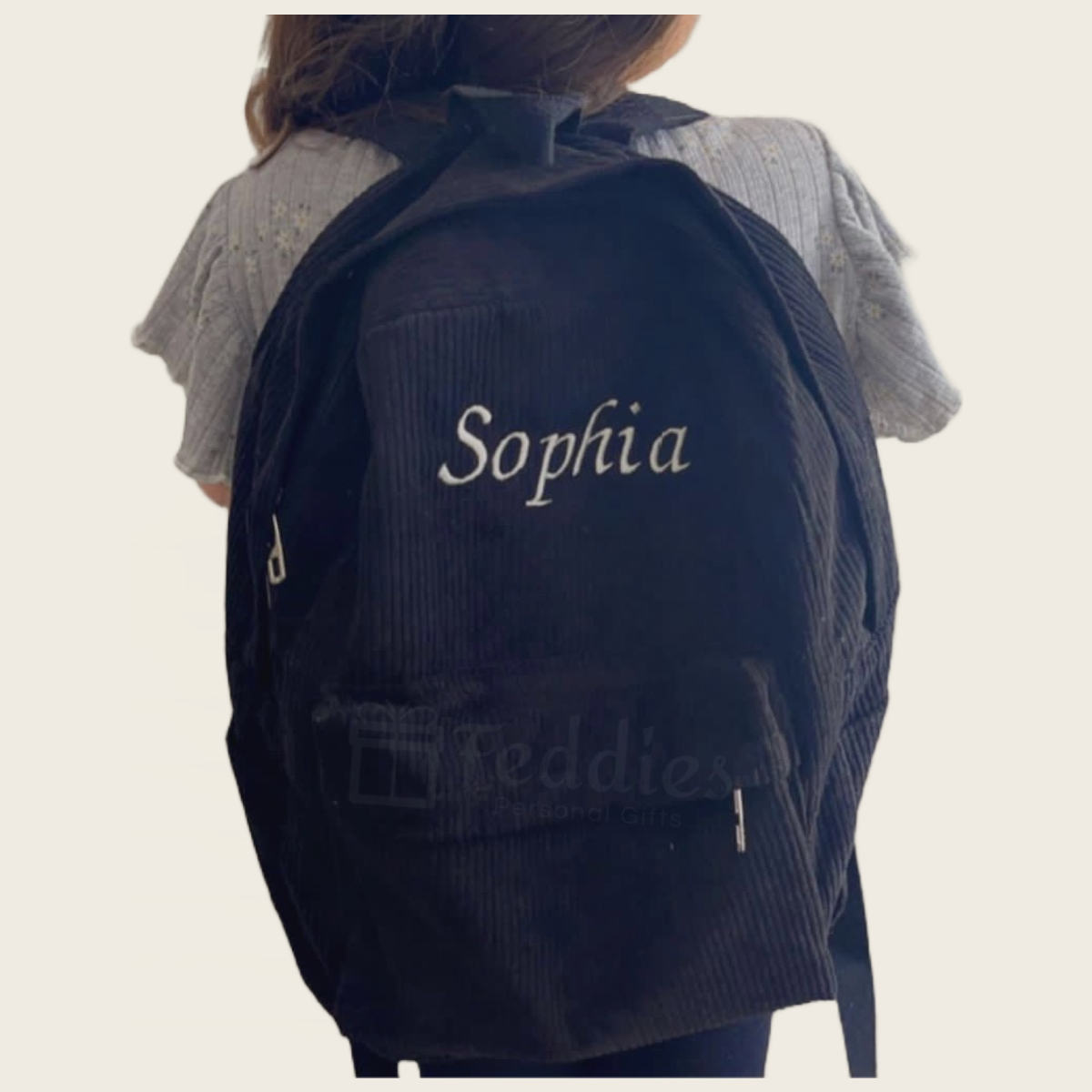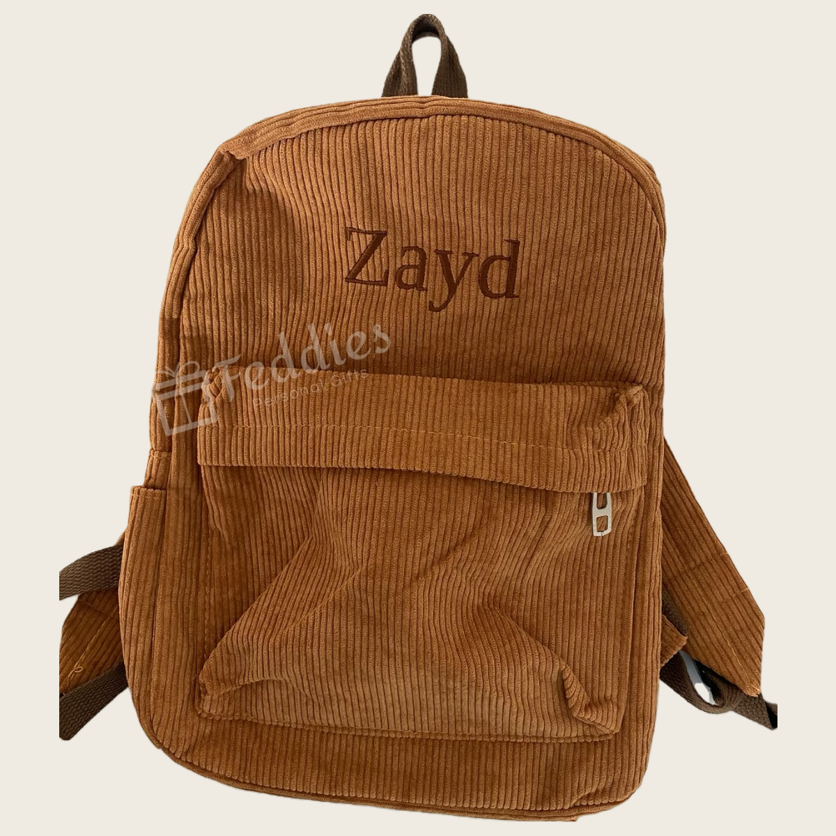 Deze stijlvolle ribfluwelen rugzak wordt door middel van borduring gepersonaliseerd met de naam. Een unieke eigen tas, die niemand anders heeft. De rugzak is gemaakt van stevige ribstof, heeft twee zijvakken en voor een vak met rits.